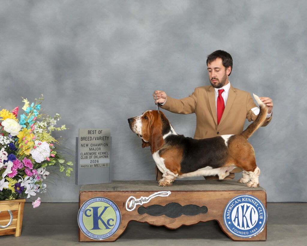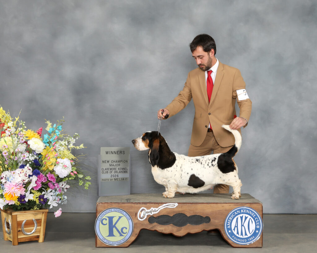 Stonewall That Thing Got a Hemi In It finished his Championship with a 3 point major in Claremore OK. When you think about Basset Hound “type” you are thinking about Hemi. He is happy, goofy, has a gorgeous head and loads of skin, I expect to see plenty of lovely pups from him in the future.