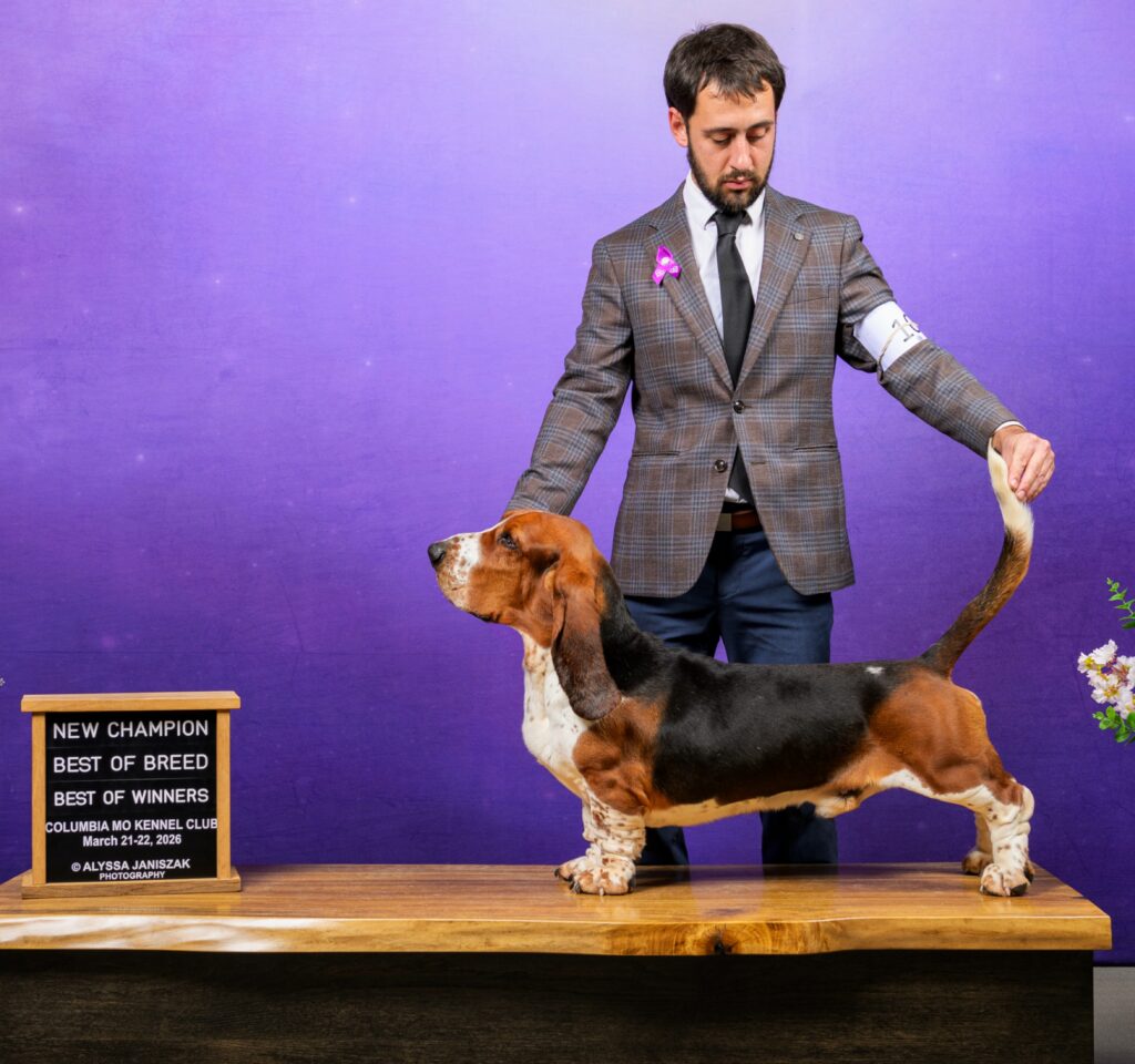 Our girl “Tara” had multiple Best of Breed wins recently to finish her AKC Conformation Championship. She joins her sister Agatha in our Champion rolls here at the farm! Update: We have went on to enter Tara in several larger exhibitions where she competed against other Basset Champions and she has now earned AKC Grand Champion status.
